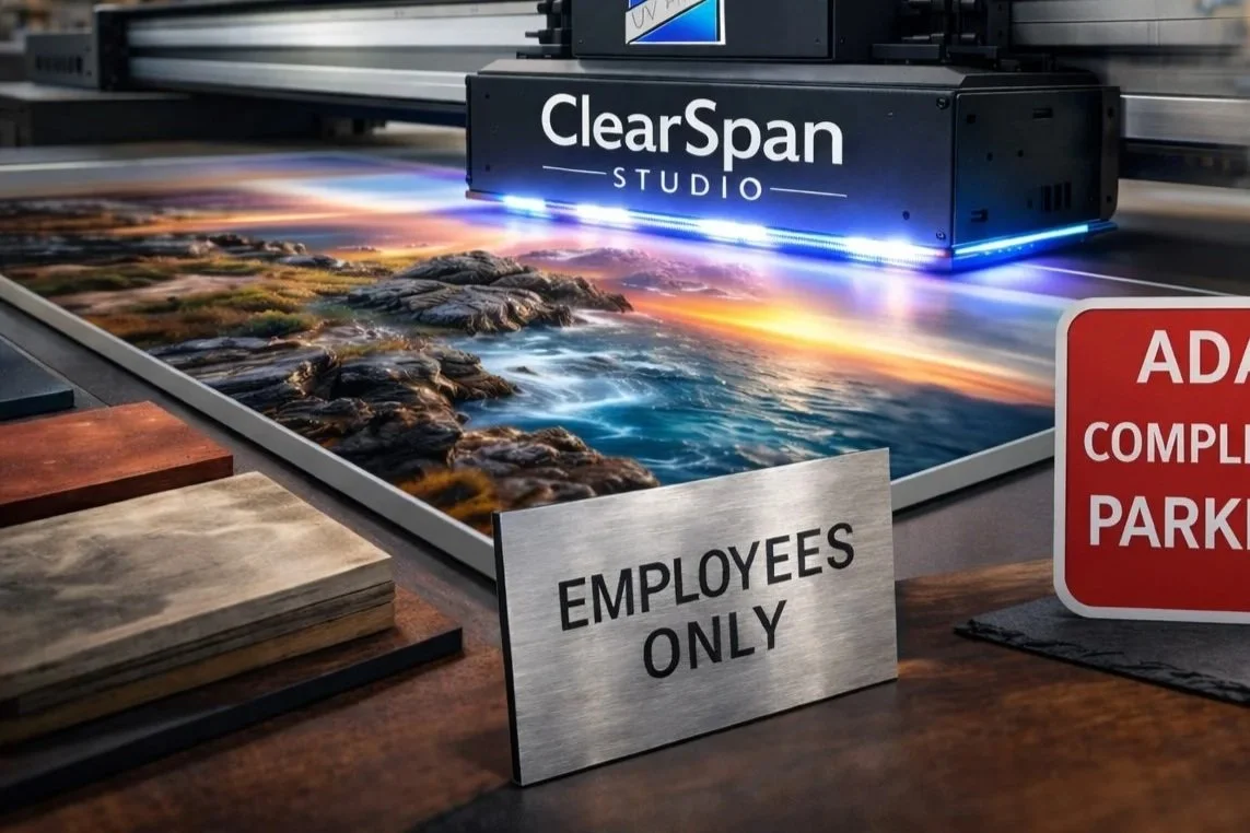 All ClearSpan Studio pieces are produced in the USA using our professional-grade UV flatbed system, allowing us to print directly onto materials without films, decals, or transfers. This direct-to-surface process delivers exceptional clarity and permanence while giving us the flexibility to work across a wide range of applications. From custom art panels and decorative pieces to commercial signage, parking and property management signage, branded displays, and specialty one-off projects, we tailor each job to the material, environment, and intended use.